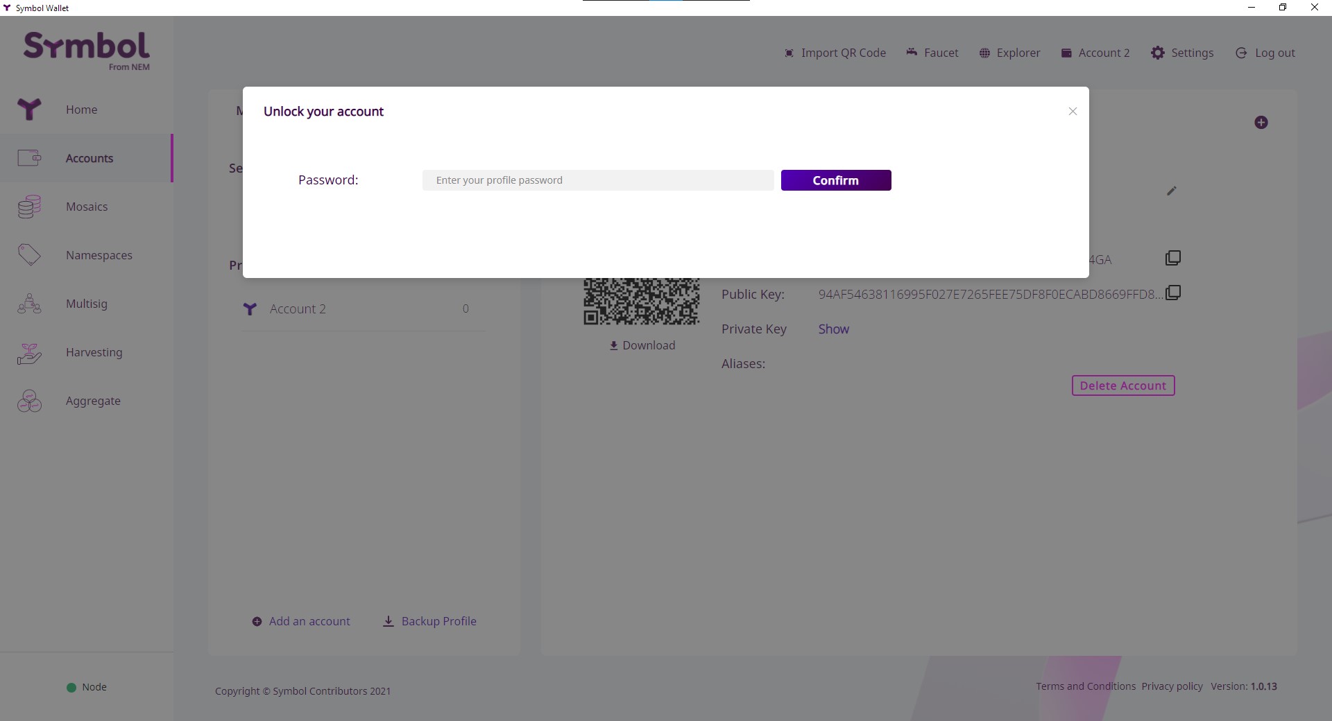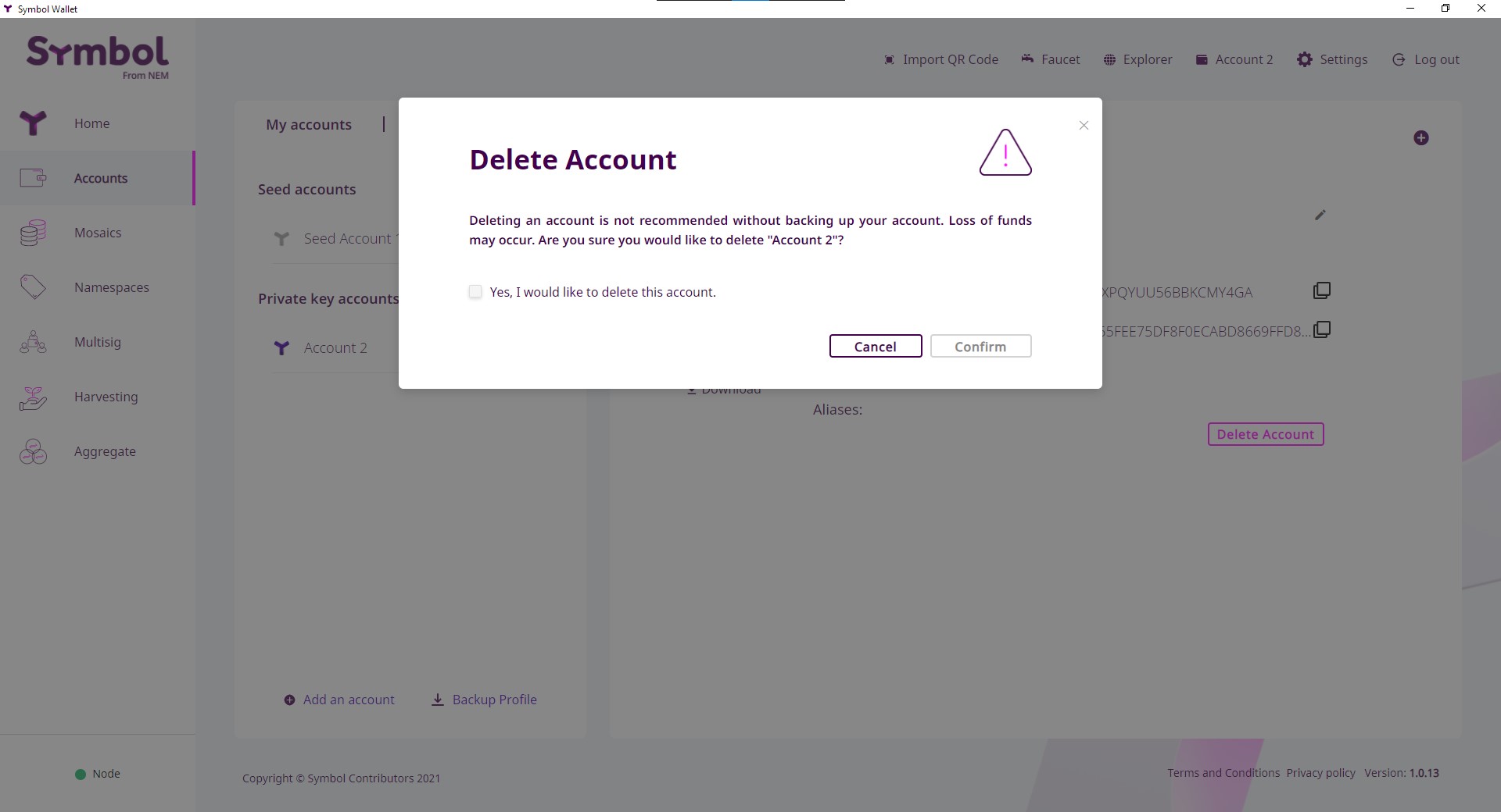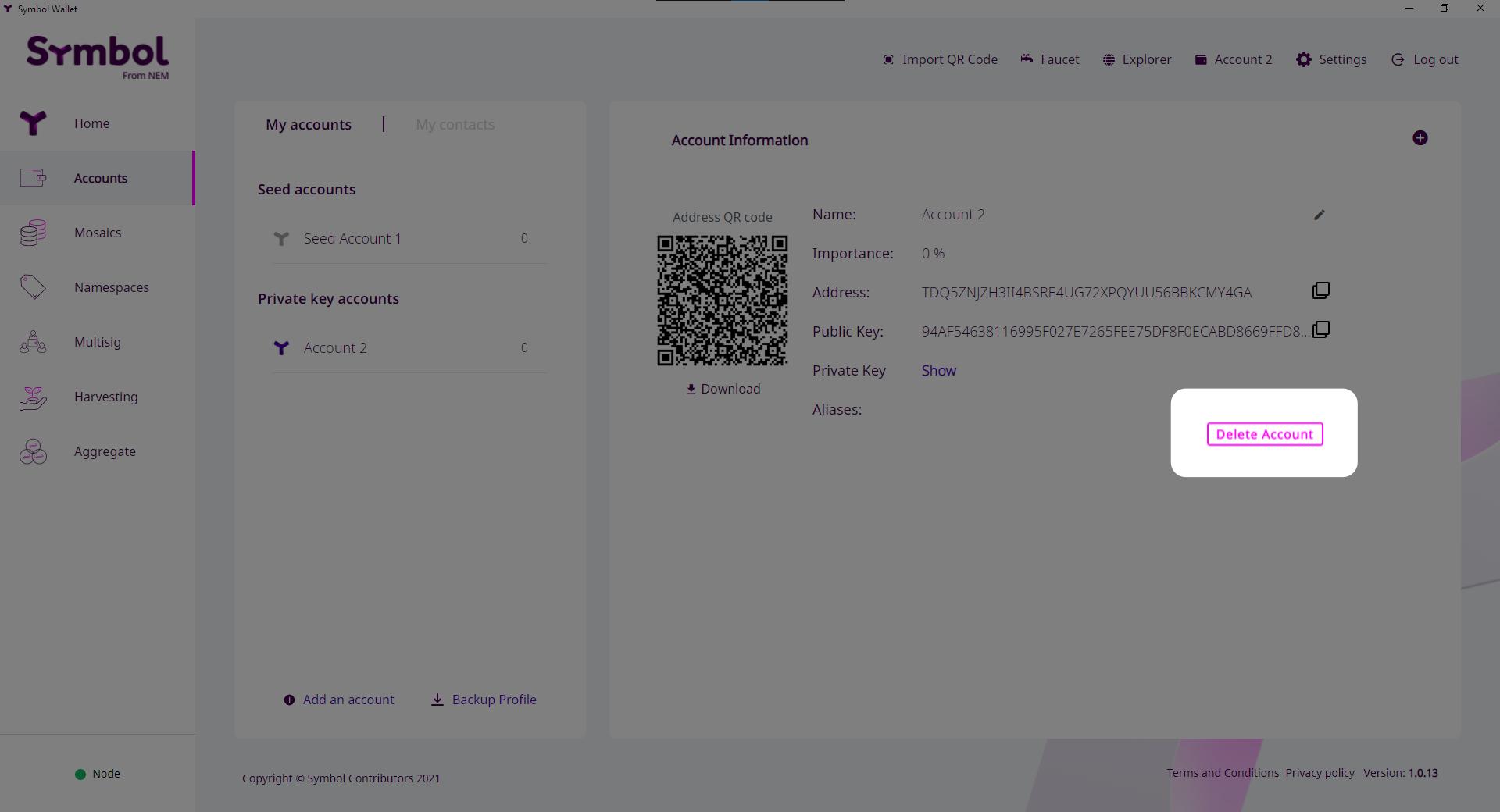 This page explains how to delete an existing account from a profile in the Symbol Desktop Wallet.