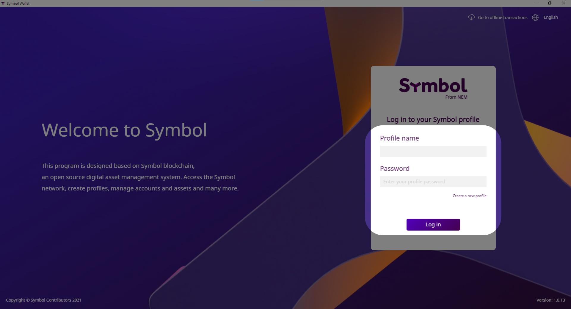 You must already have a profile set up in the Symbol Desktop Wallet, either by creating a new one or importing an existing one.