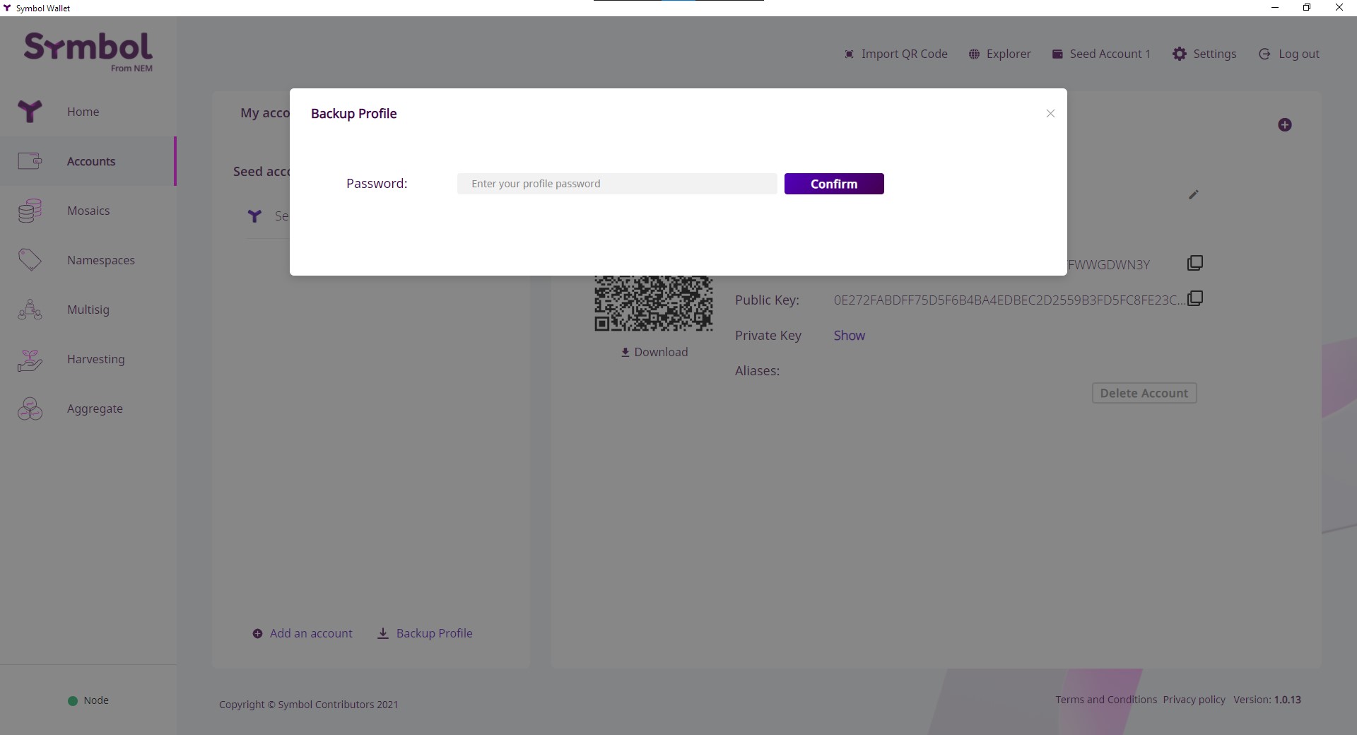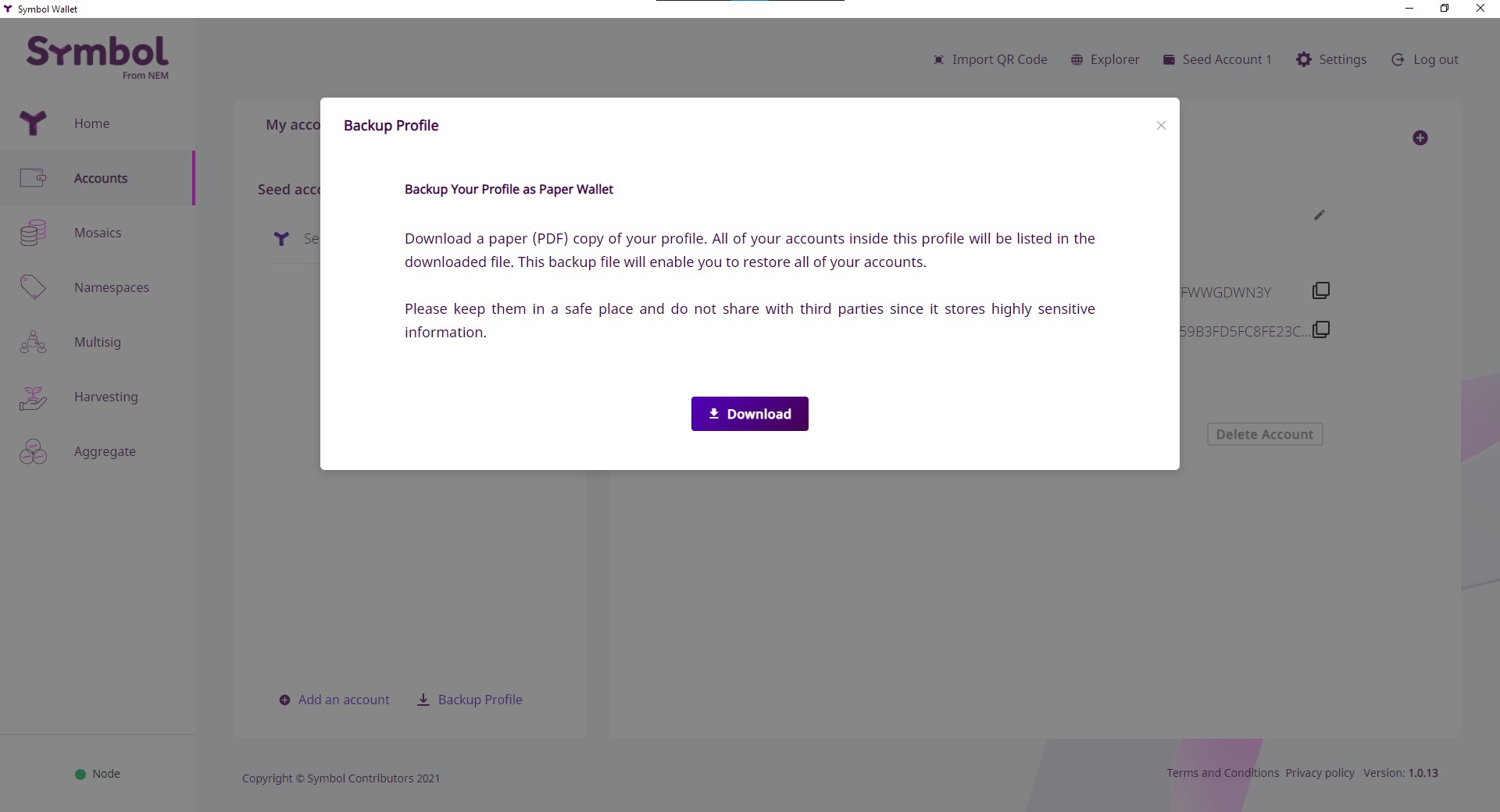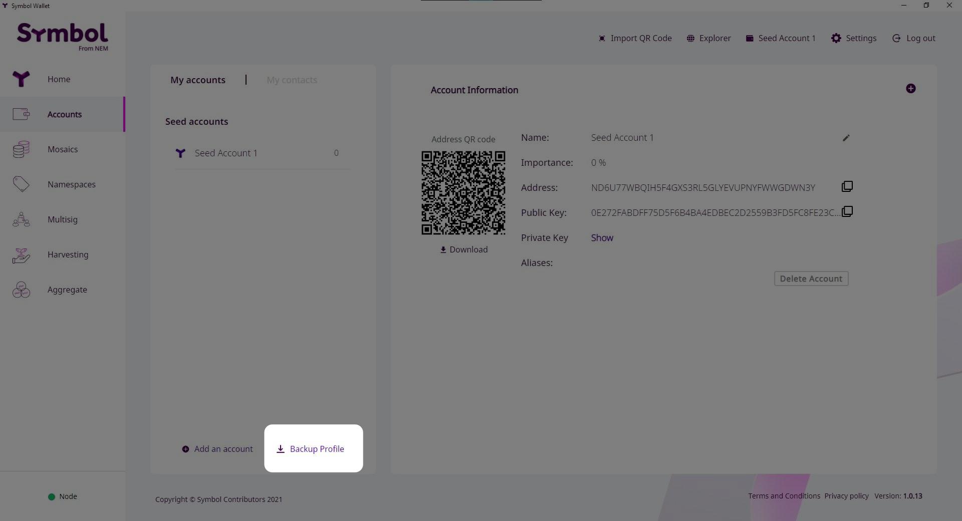 - Follow the Importing a Profile tutorial to restore it on a new device or installation of the Symbol Desktop Wallet.